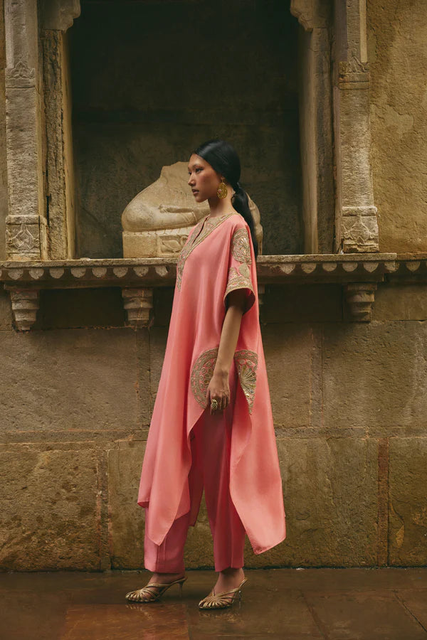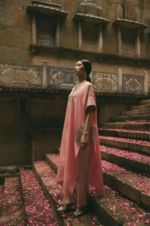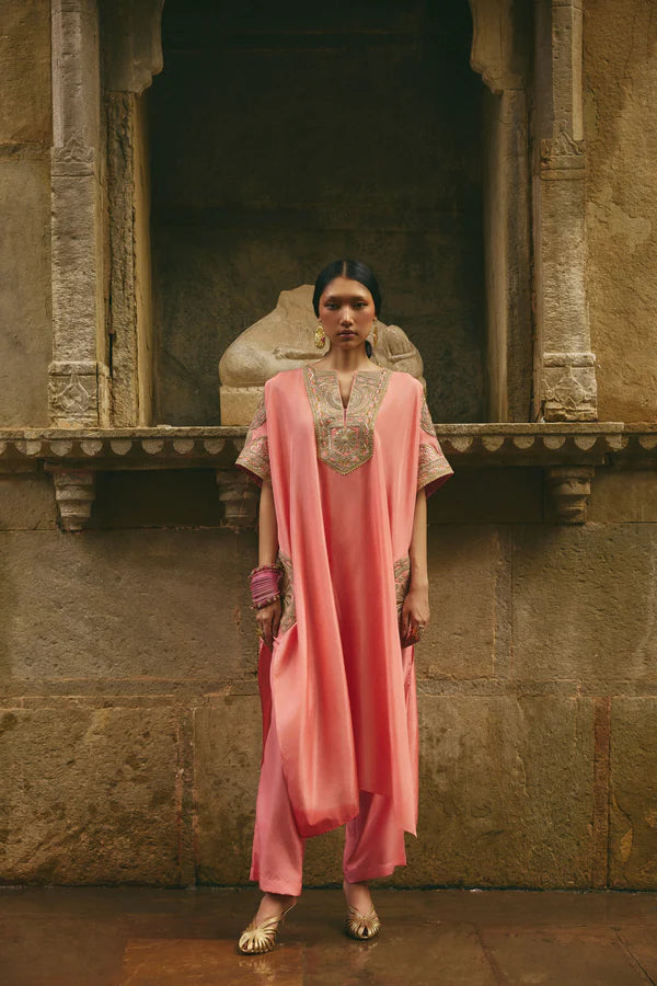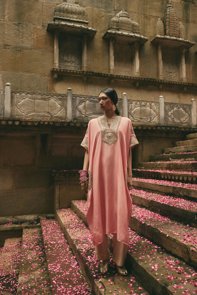 This beautifully crafted Pink Kaftan features intricate gota and dori placement embroidery, paired with matching Silk Pants — a perfect ensemble to make a statement.