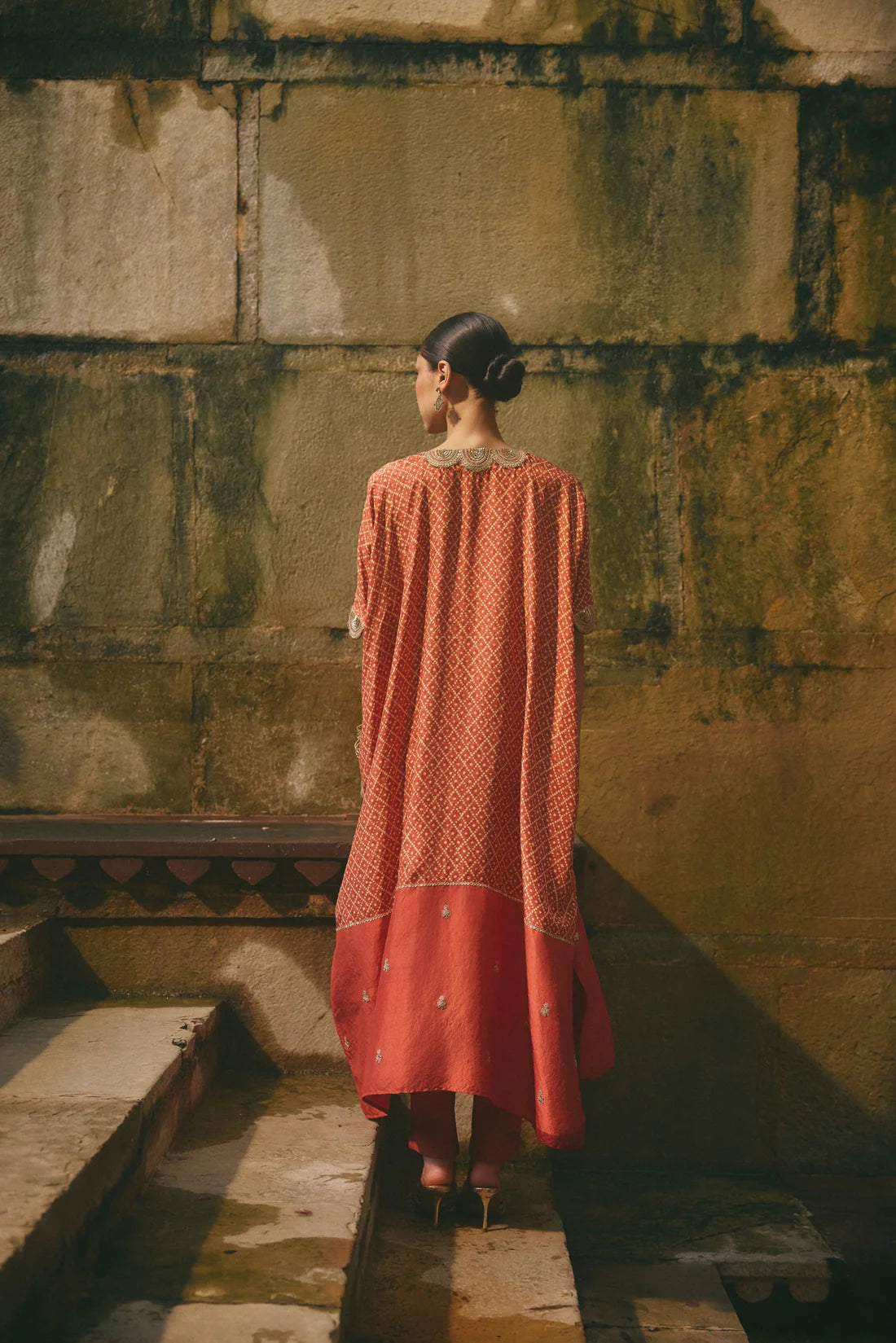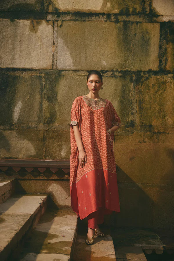 This printed silk kaftan features intricate dori embroidery on the yoke and sleeves, complemented by a solid bottom panel embellished with embroidered motifs. It is paired with matching cotton lycra pants for an effortlessly elegant look.