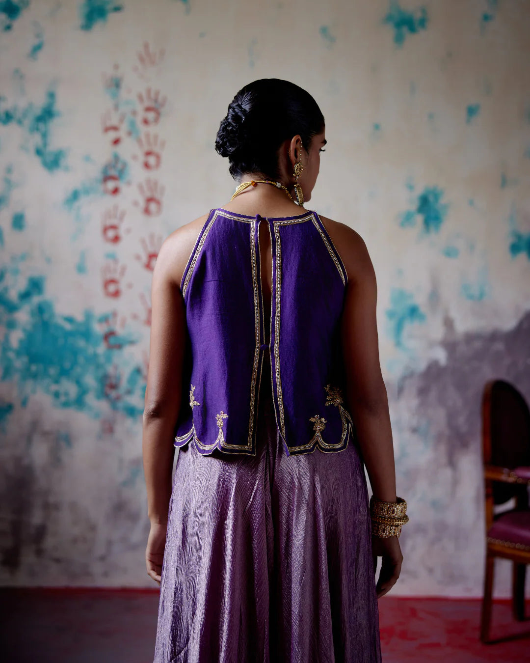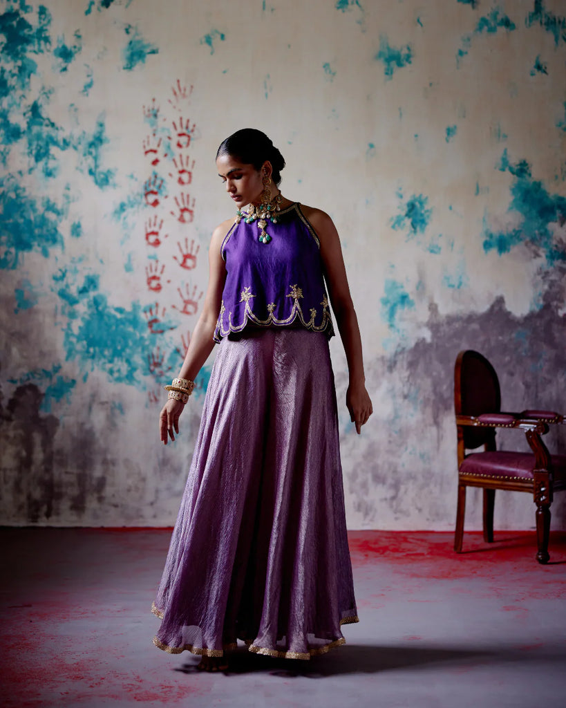 Purple Co-ord Set combines elegance and comfort with a silk short top featuring a halter neckline. Its delicately embroidered signature motif on the hem adds a refined touch, while the open back with button closures enhances its stylish appeal.