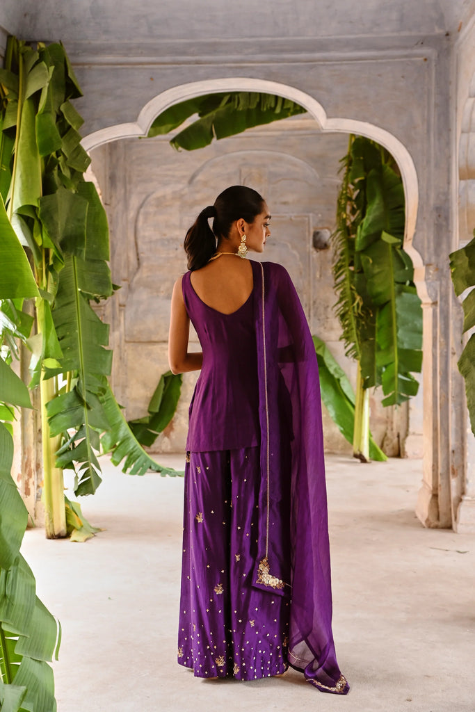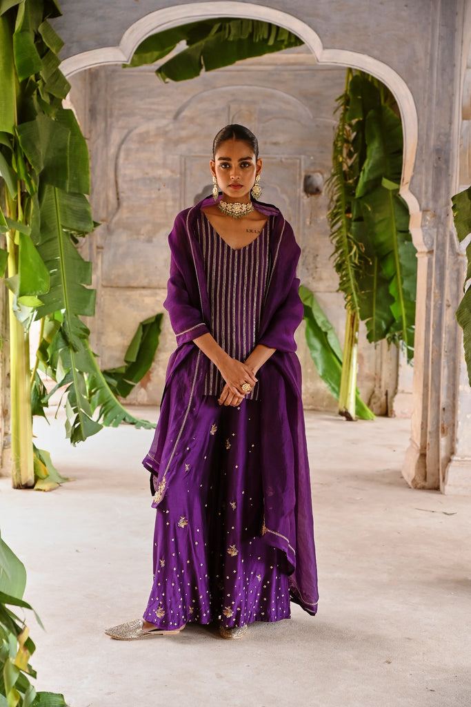 Featured here is our short kurta in purple with embroidered lines. The kurta is paired with flared trousers with hand embroidered pool guccha details and organza dupatta.