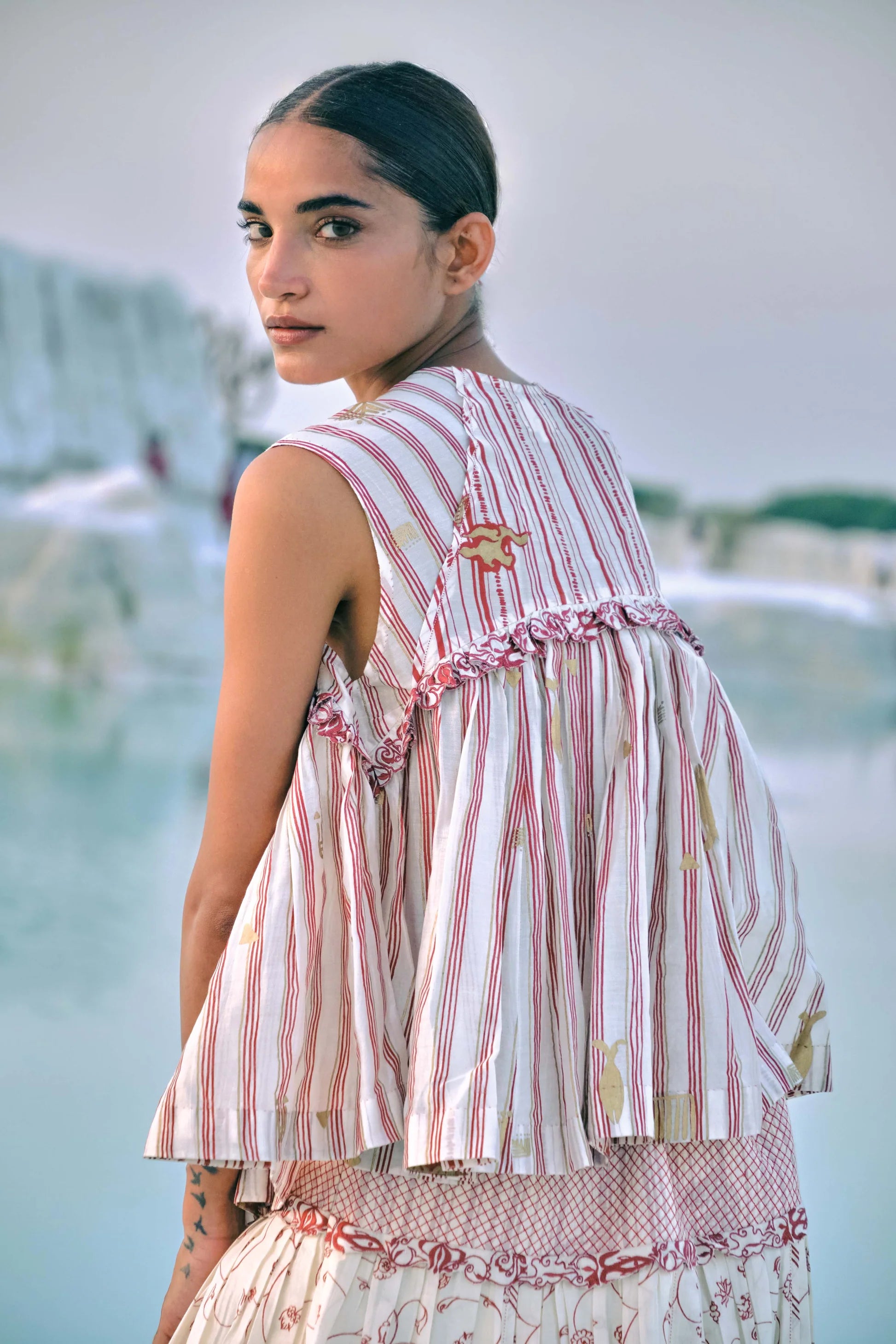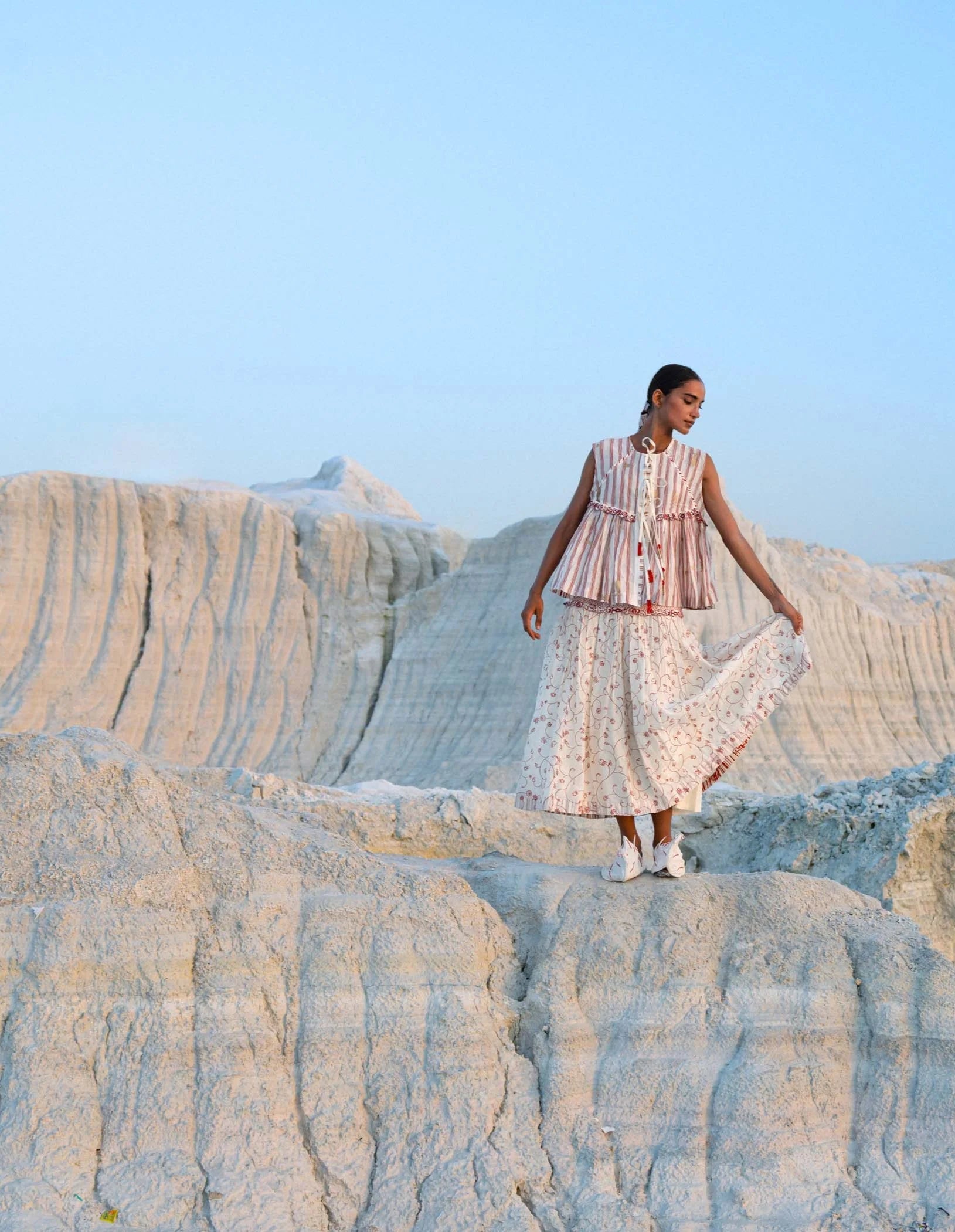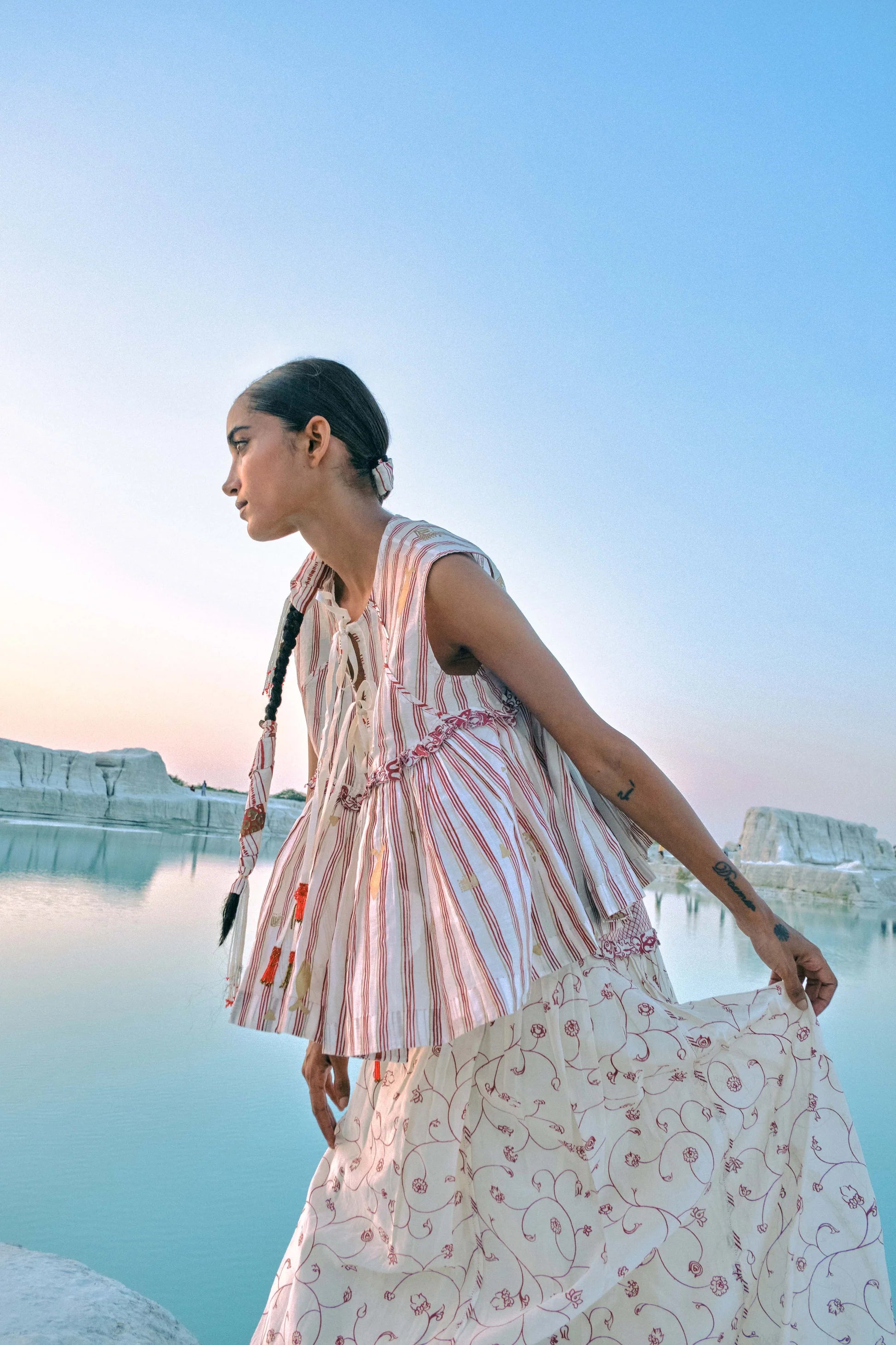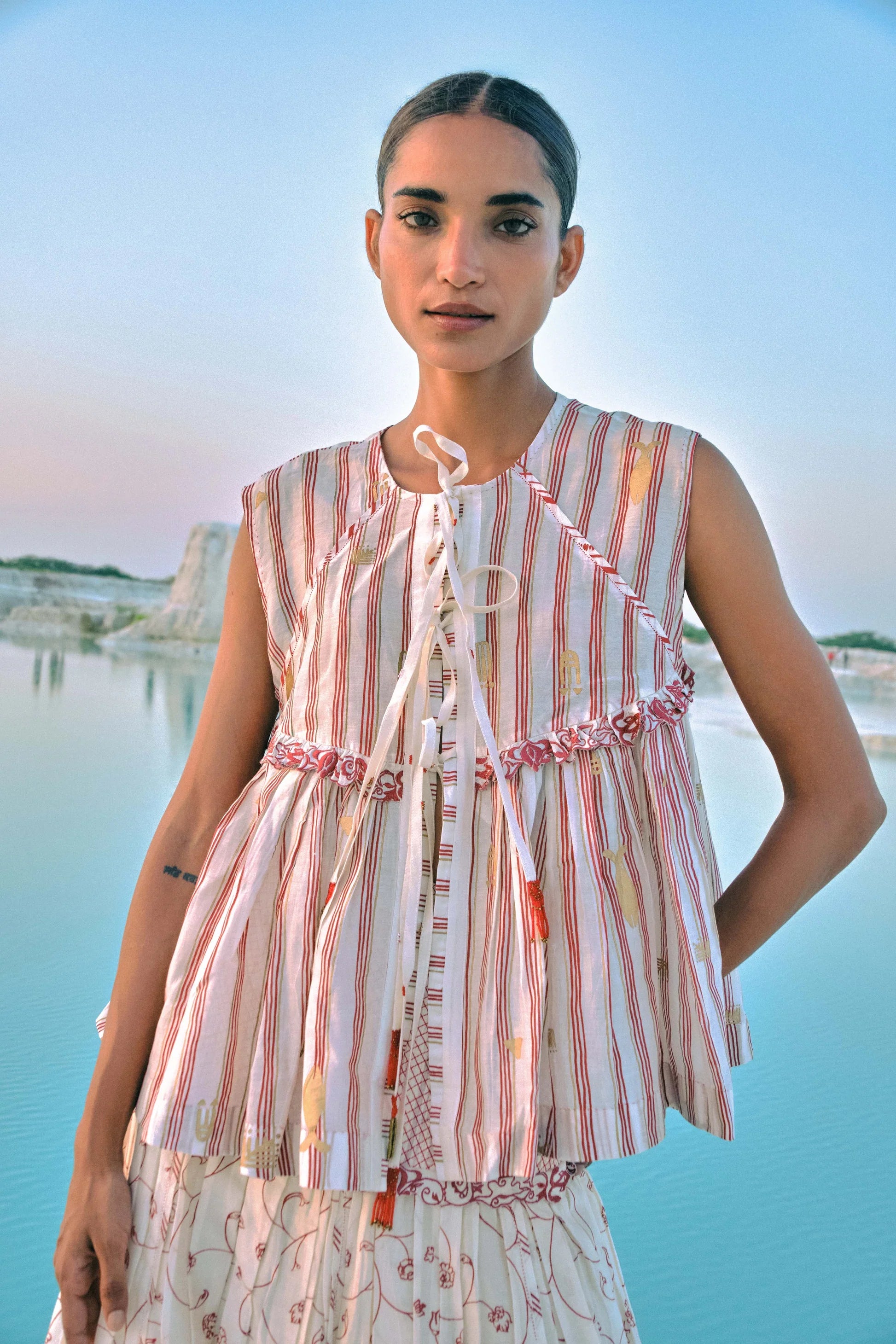 Crafted from hand screen-printed cotton silk, this top is defined by delicate front tie-ups finished with handmade tassels, creating a soft and graceful flow. Hand-embroidered lace along the yoke complements the printed motifs, adding a subtle touch of artisanal detail. Light, effortless, and fluid, the piece captures a sense of ease and quiet elegance, brought to life through hours of careful craftsmanship.