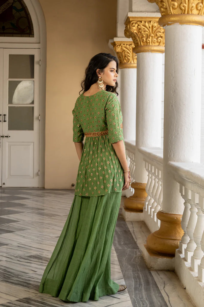 Meet Ragini She radiates poise in a pure Chanderi peplum and plazzo set in rich olive green, where the V‑neckline and elbow sleeves are framed by exquisite machine and hand-kalied square butti work that shimmers across every panel. The fitted peplum flares into fluid kali plazzo bottoms, offering both structure and ease. Traditional embroidery motifs—meticulously executed by machine and hand—imbue the ensemble with artisanal finesse. Ragini is the perfect harmony of contemporary form and timeless Chanderi craftsmanship—simple yet deeply striking.