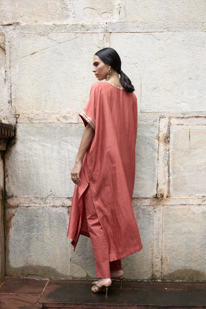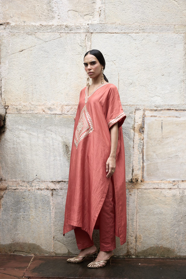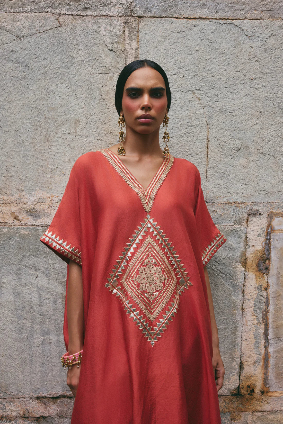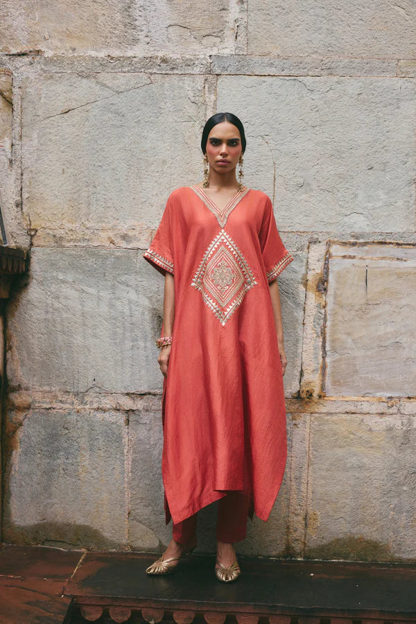 Elevate your style with this striking Red Kaftan Set, featuring intricate gota and dori embroidery in a refined geometric pattern. Perfectly paired with matching cotton pants for an effortlessly elegant look.