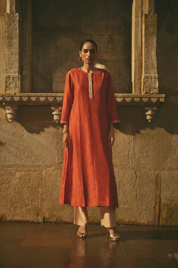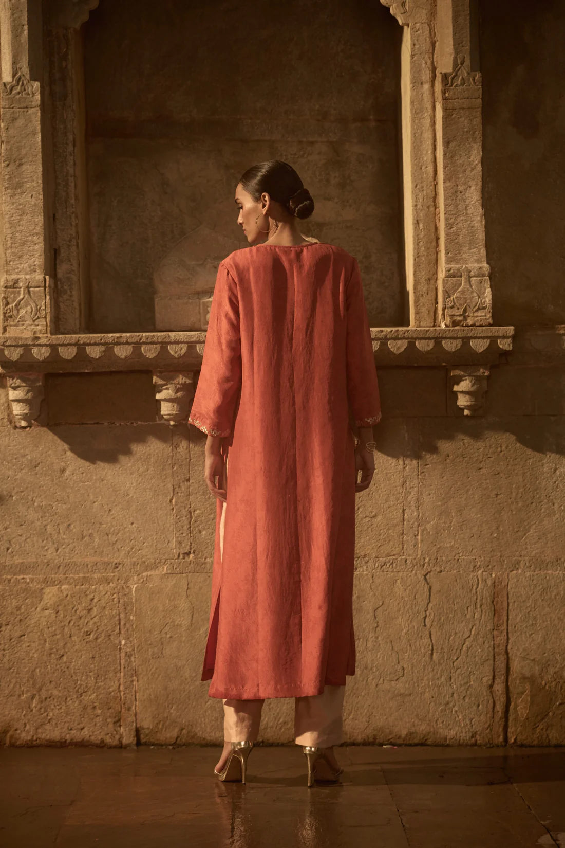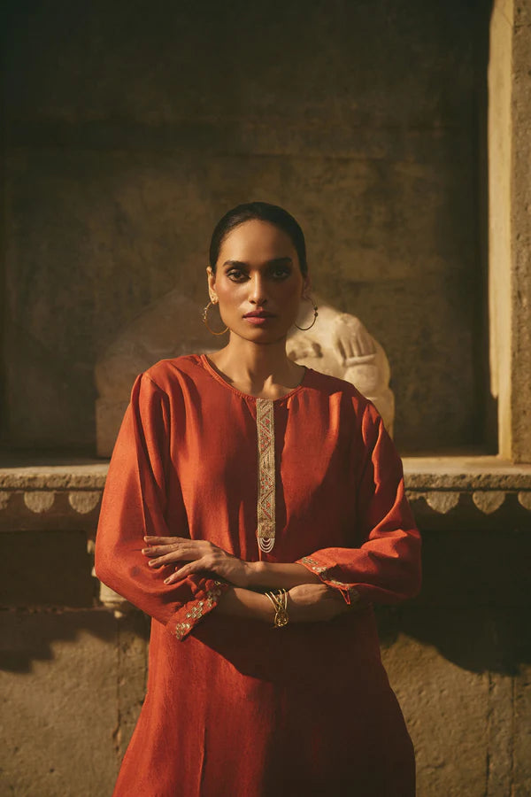 This printed red silk kurta is adorned with delicate gota and dori embroidery, beautifully enhanced with intricate moti detailing for an elegant finish.