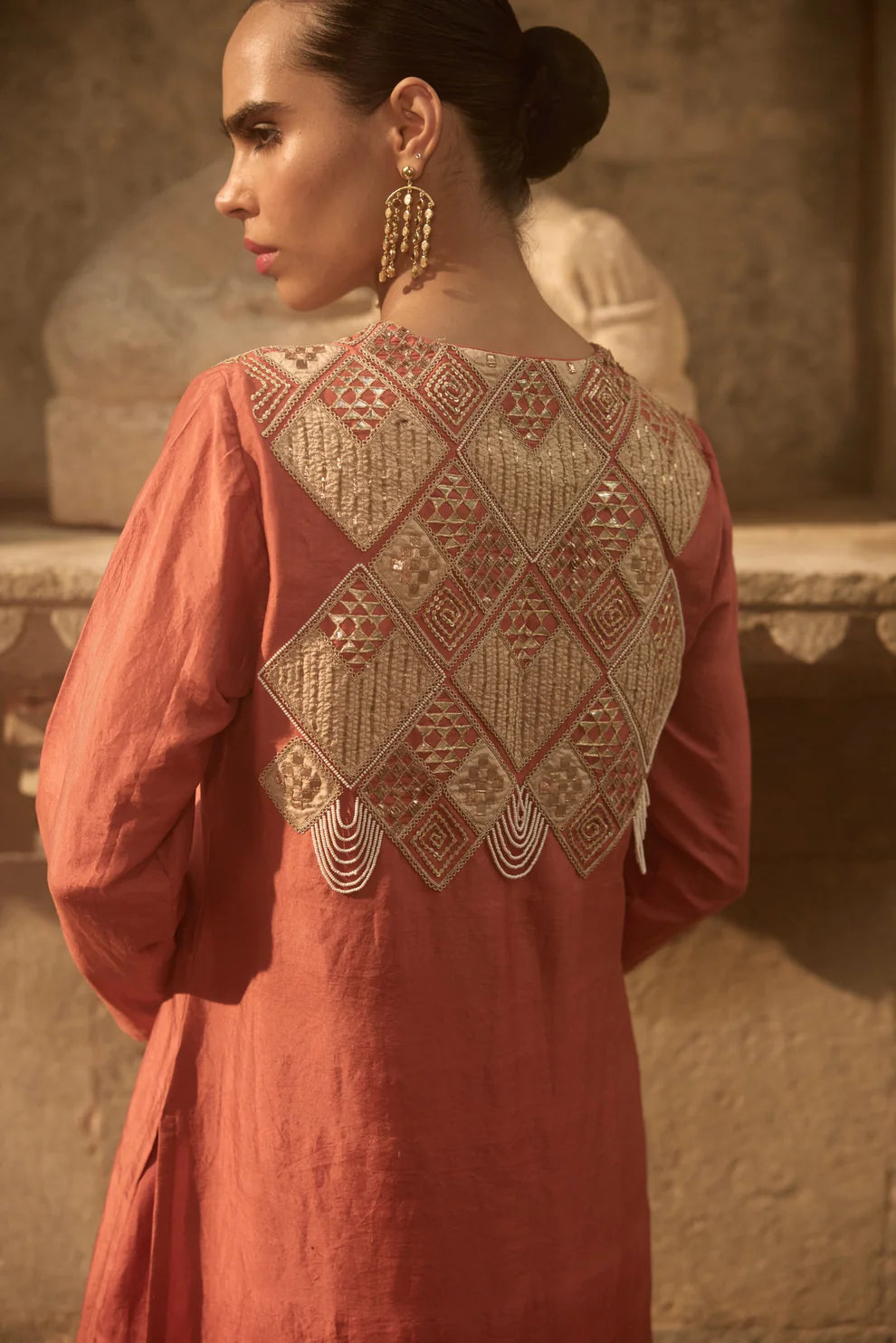 Make a statement in this bold Red Silk Kurta features stunning gota, dori and patchwork embroidery on the upper front and back. Paired with matching Silk Pants, this outfits is ideal for special occasion.