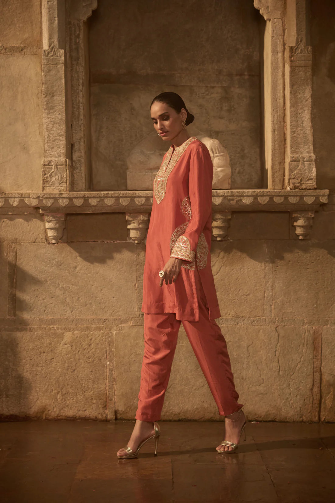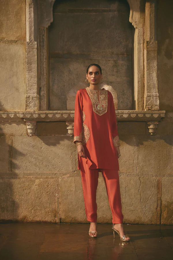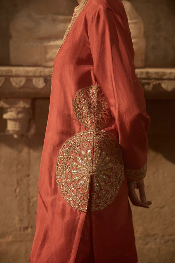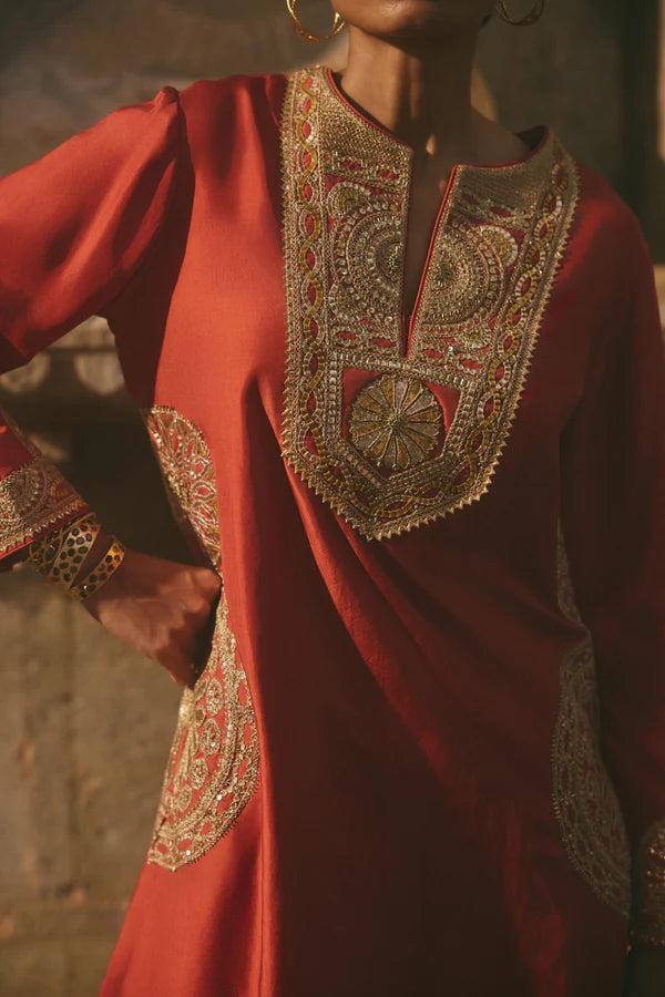 Elevate your style with this striking Red Silk Short Kurti, featuring intricate gota and dori embroidery placements, paired elegantly with matching Silk Salwar.