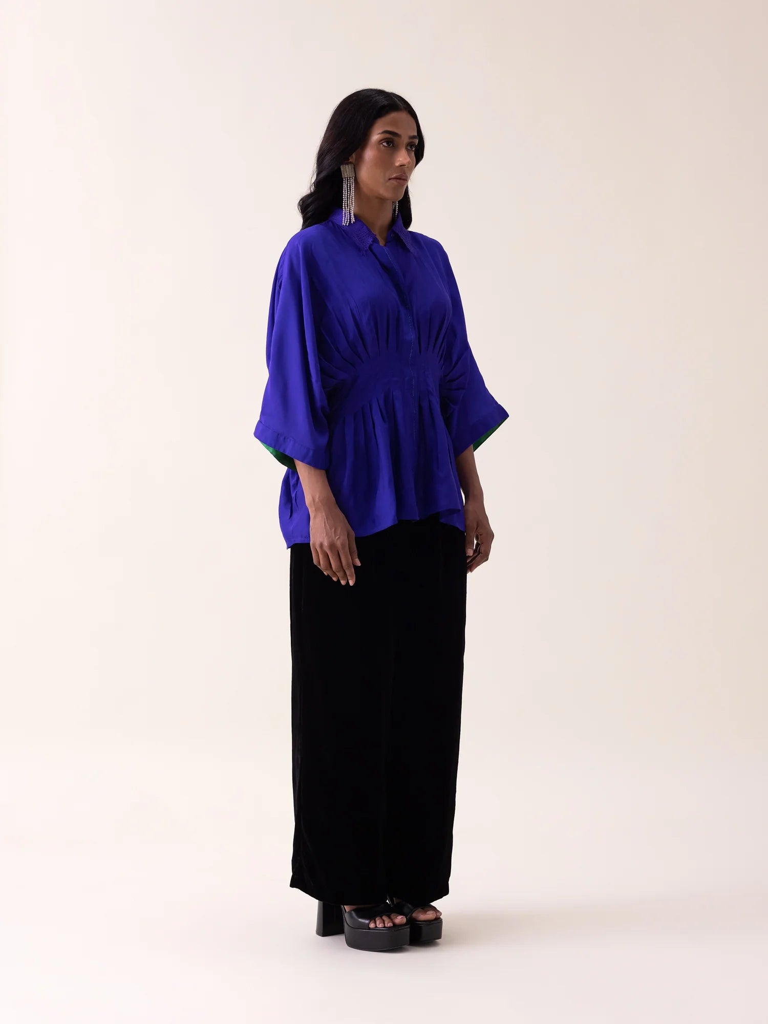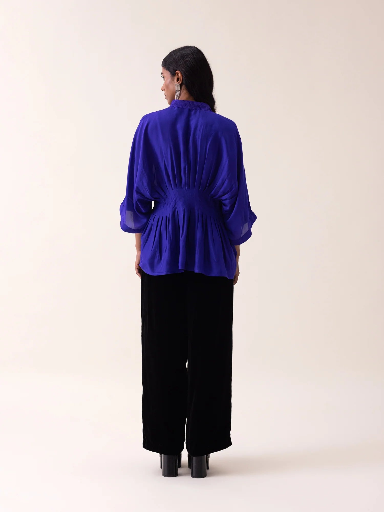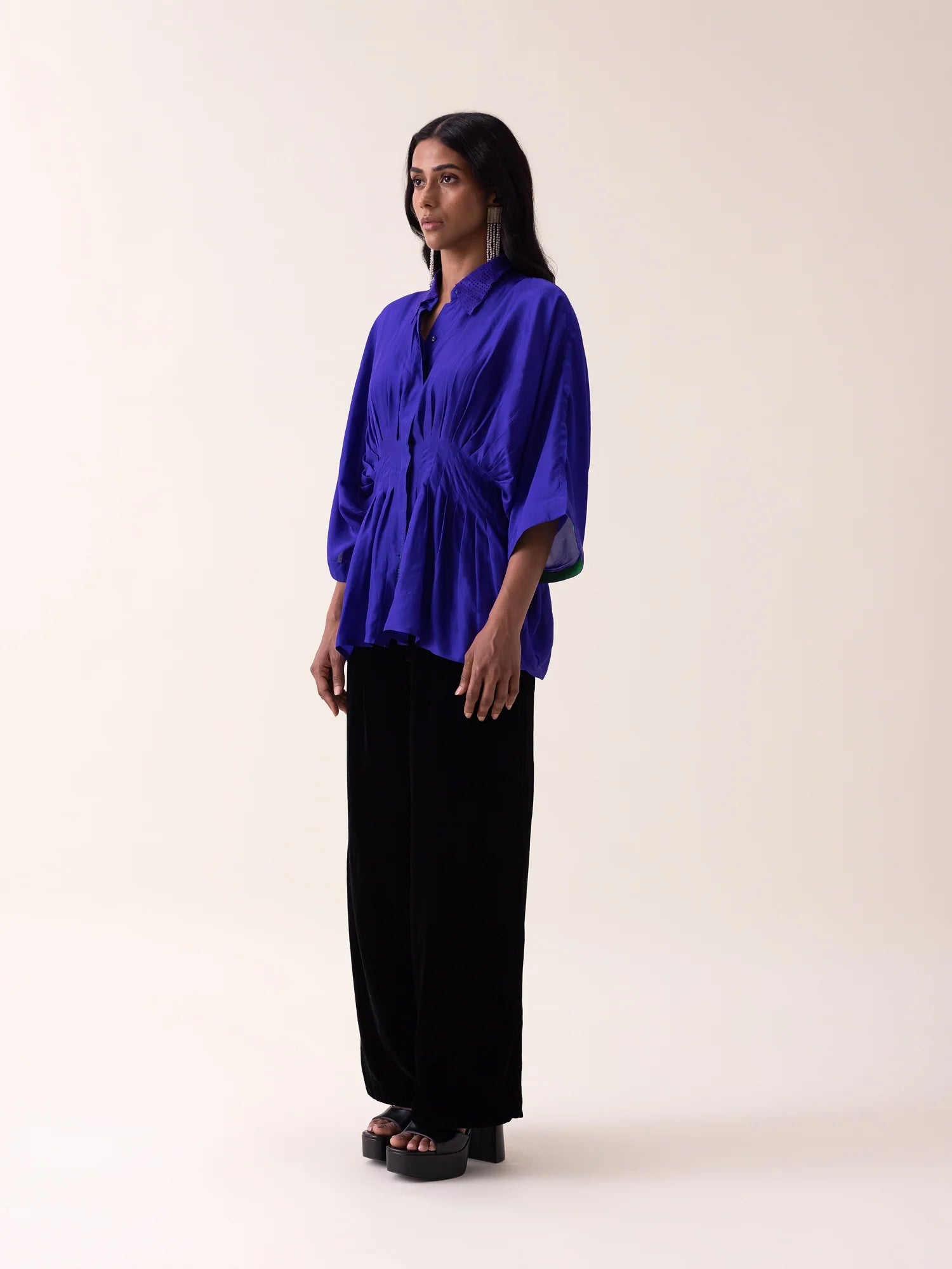 Habutai silk shirt featuring laser-cut circular collar detailing and subtle neon-green stitch accents. Raglan sleeves and soft box pleats lend sculptural ease and fluid movement, while the twilight blue tone adds a modern, confident edge.