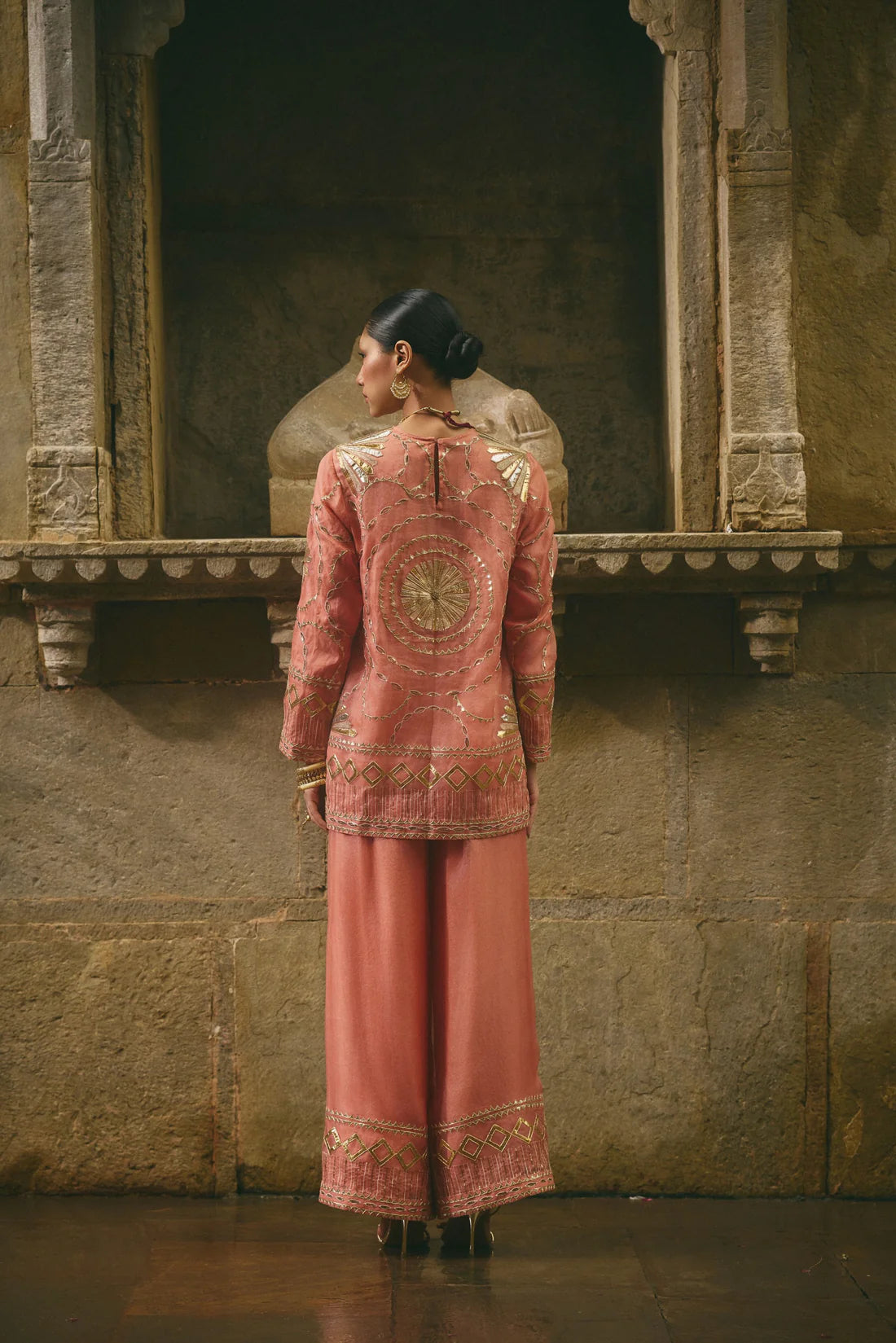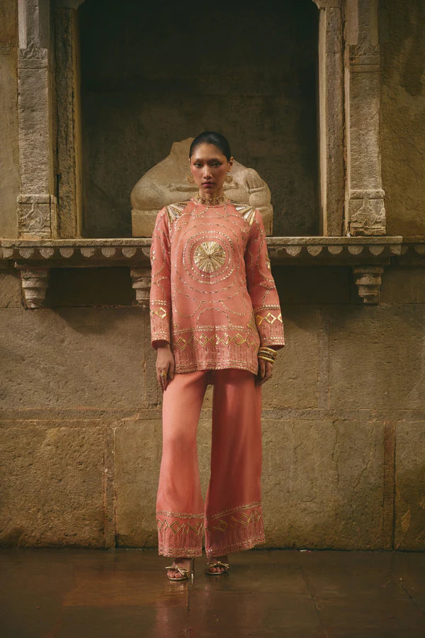 This beautifully crafted pink organza kurti set features intricate kachi patti gota embroidery throughout, forming a captivating geometric pattern. The matching organza pants are detailed with complementary gota work, lending an elegant and sophisticated finish to the ensemble.