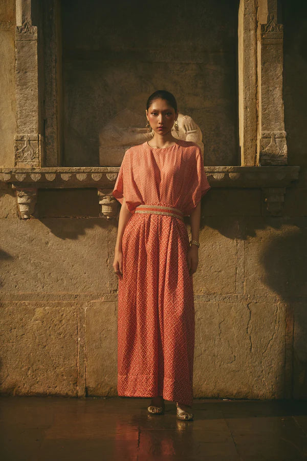 This full-length dress is crafted in two contrasting prints and comes with a beautifully detailed belt adorned with gota and dori work.