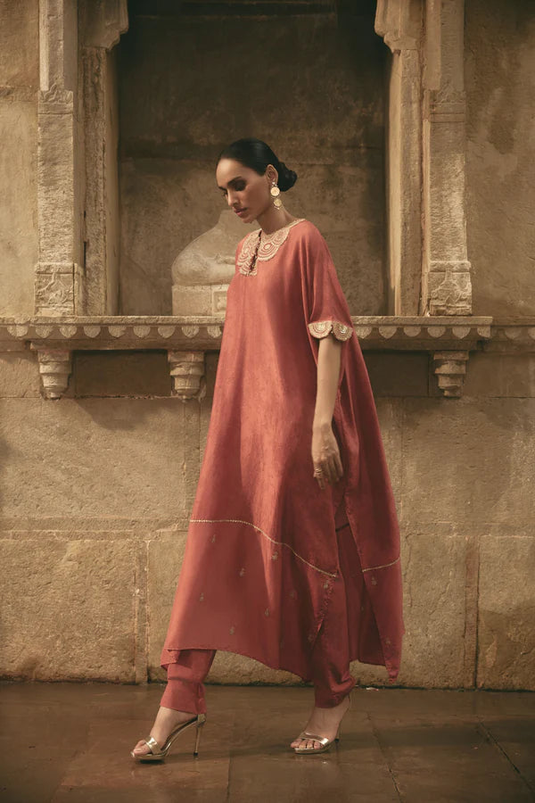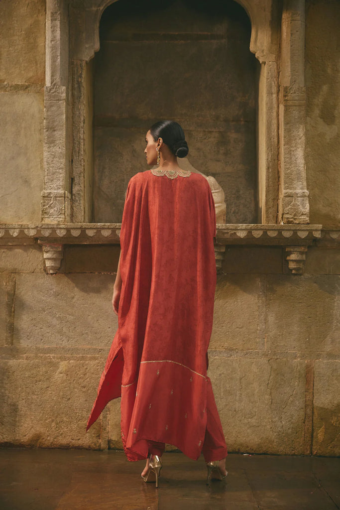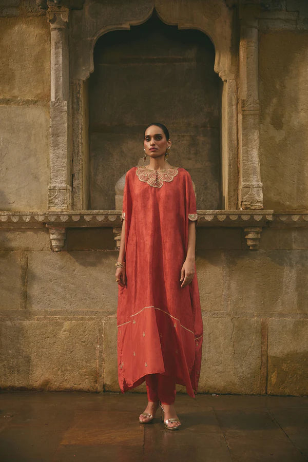 This printed rust kaftan set features intricate dori work on the yoke and sleeves, complemented by a solid bottom panel embellished with embroidered motifs. It is paired with matching cotton lycra pants for a refined finish.