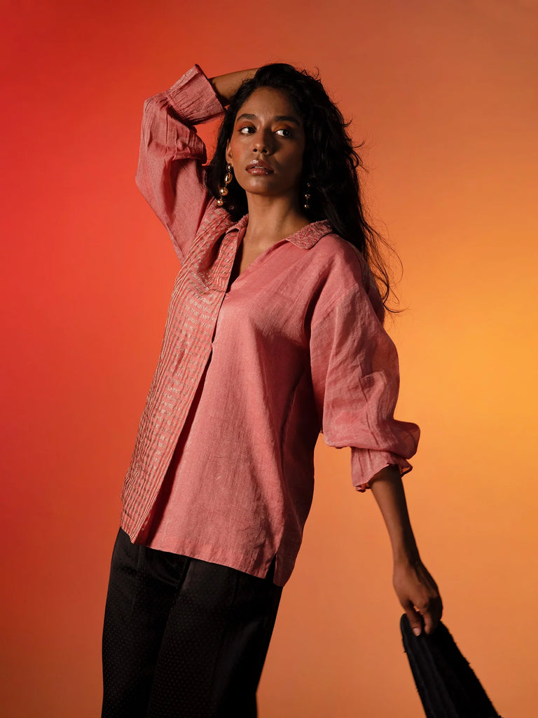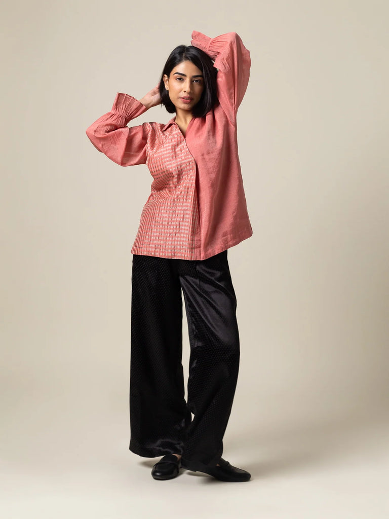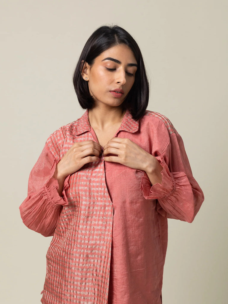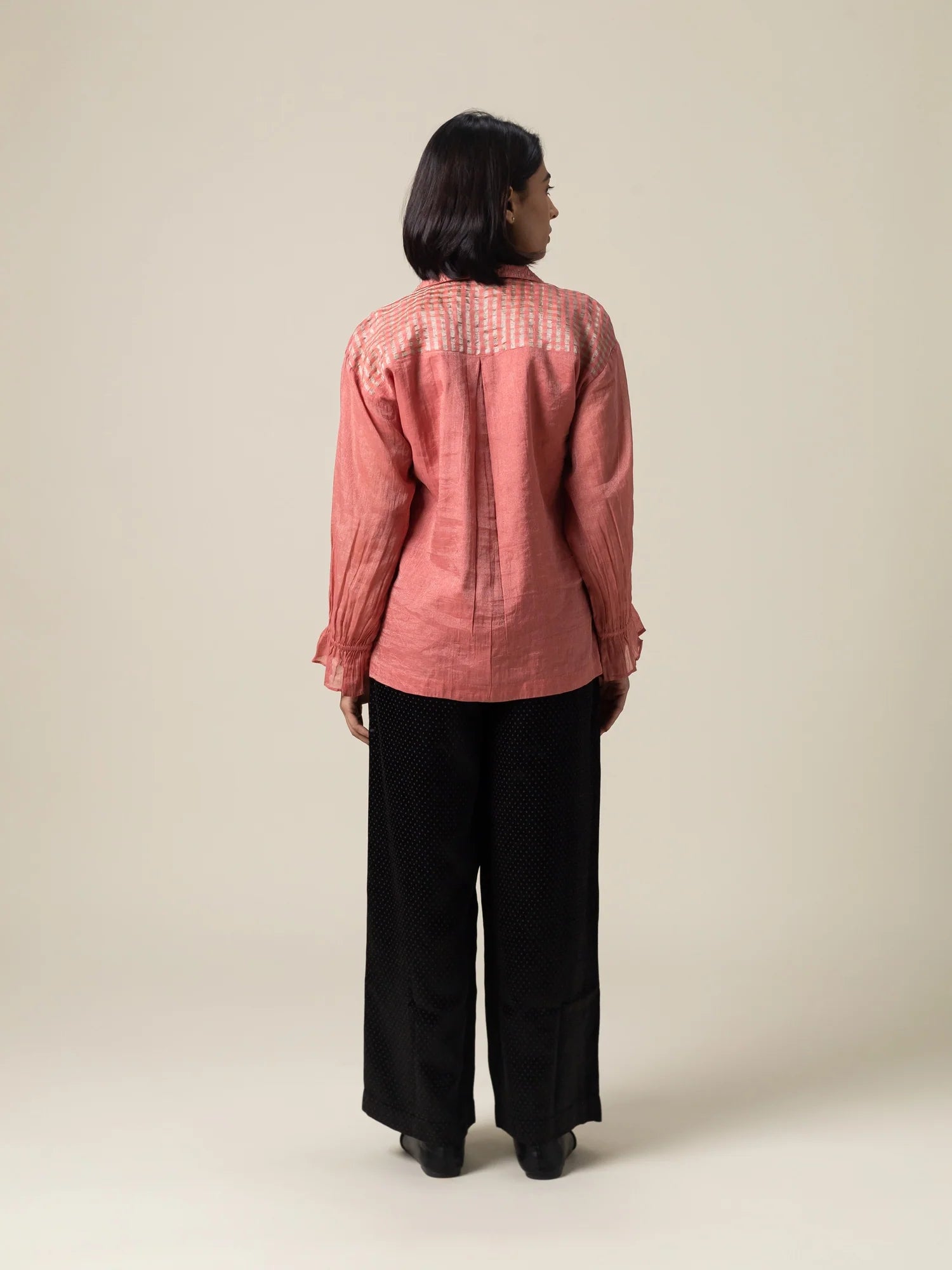 he Shingen top, crafted in delicate pink tissue fabric, features a subtle shimmer enhanced by intricate jali textures and finely detailed overlapping neck panels. Accented with soft silver stripes and a seascape-inspired collar, it exudes graceful sophistication.