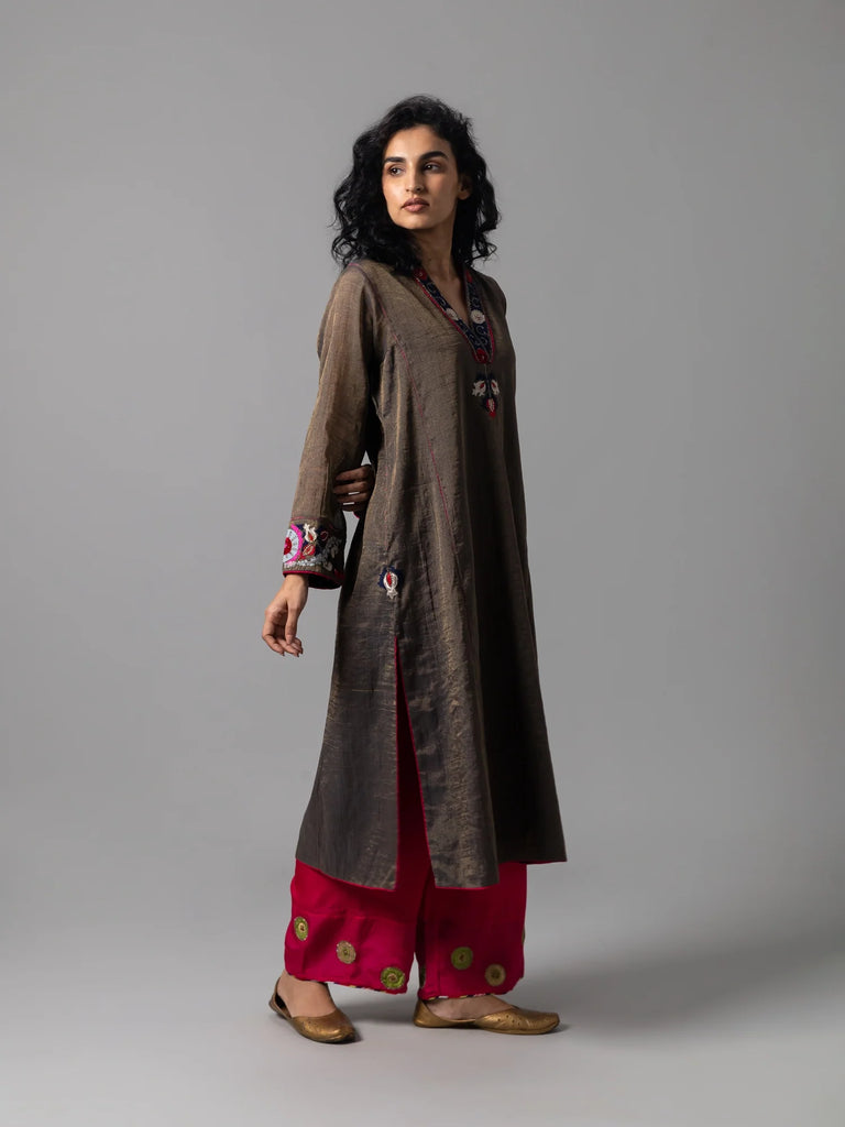 The Shireen Kurta boasts indigo-dyed fine tissue gold. Appliqued handcrafted anar/pomegranate butas and motifs, highlighted by beads and sequins.