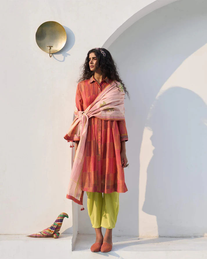 Front-open kurta crafted in handwoven 40-gm Chanderi, featuring delicate pintuck and textured detailing, enhanced with hand block printing and subtle hand embroidery. Paired with a 100% cotton slip.