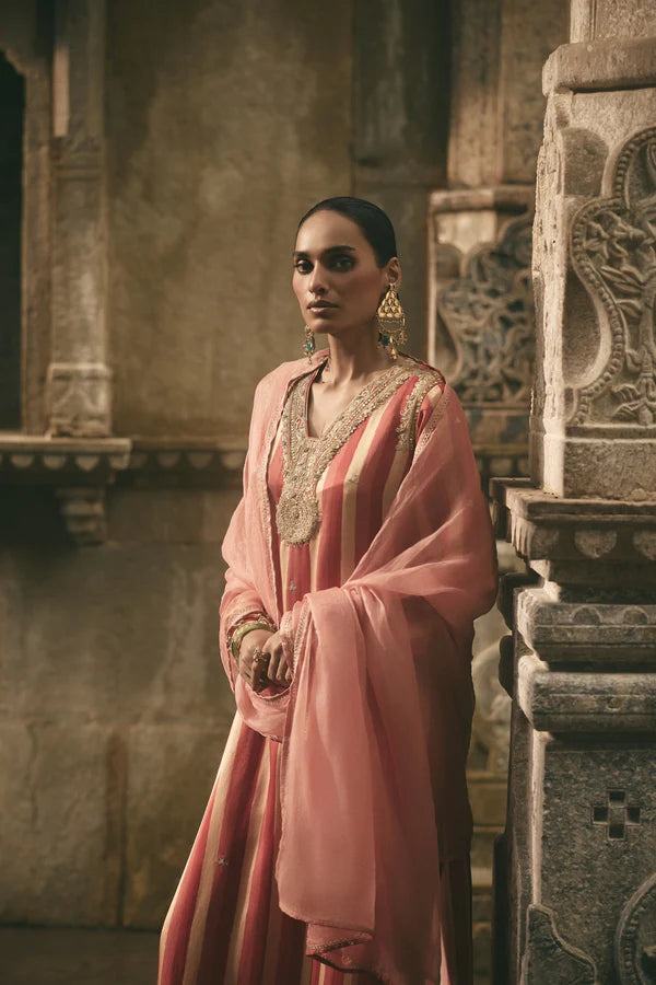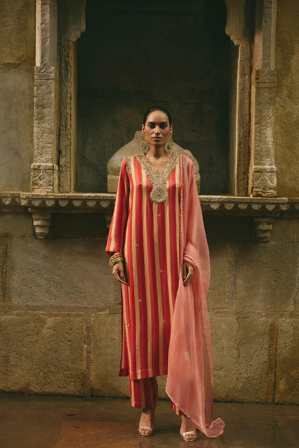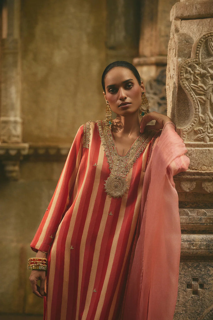 This Multi-Striped Kurta Set showcases intricate dori embroidery on the yoke, paired with coordinated pants and a delicate pink organza dupatta.