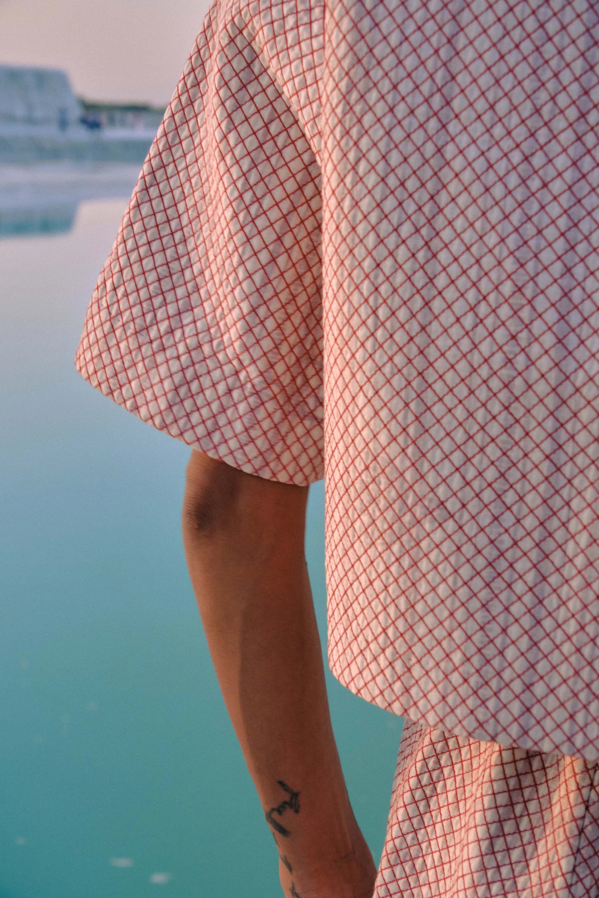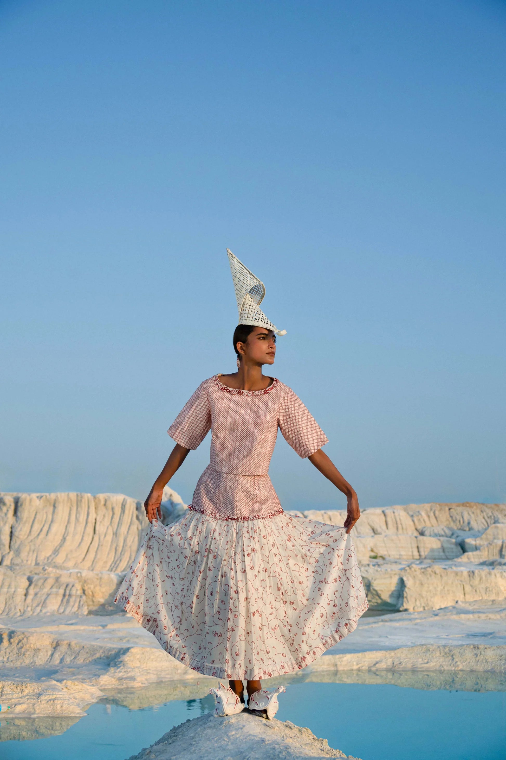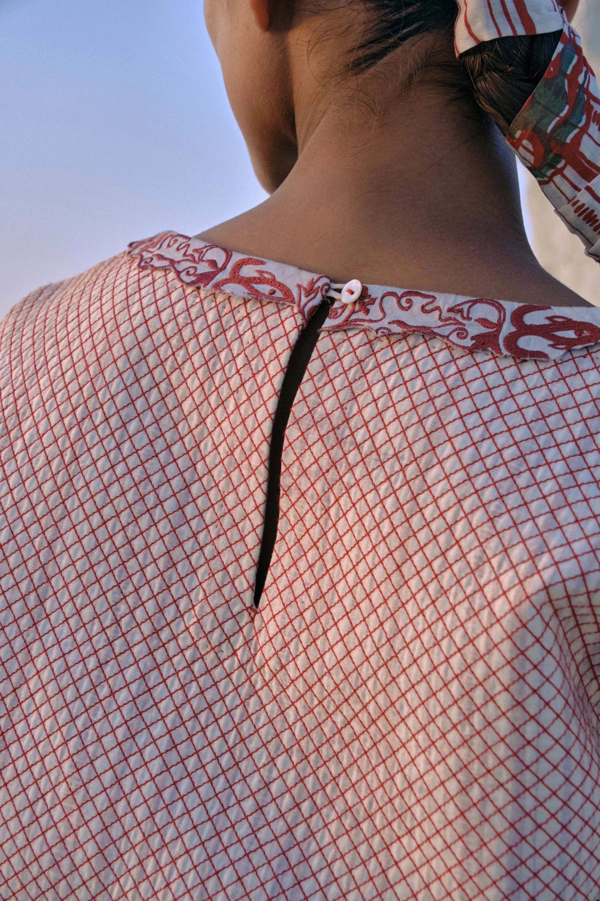 Crafted from layered fabrics—plain cotton silk and hand-screen-printed cotton—this fully quilted crop top brings together structure and softness with ease. Delicate embroidered lace at the neckline, a back keyhole detail, and a concealed side zipper add thoughtful functionality while maintaining an elegant finish. Every element is executed with careful precision, reflecting hours of skilled craftsmanship and artisanal attention to detail.