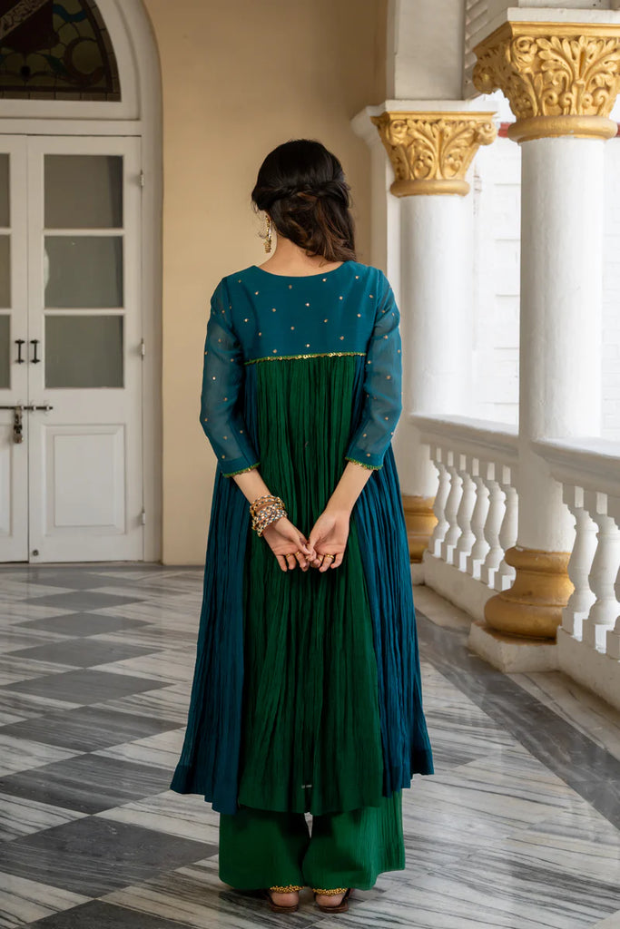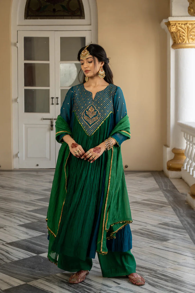 Meet Tahira. Effortless, bold, and full of charm — she enters with a quiet confidence that turns heads without trying. Draped in a striking teal pleated kurta, her relaxed silhouette carries intricate hand and machine embroidery across the yoke, lit up with hints of zari, moti, and shimmering sequins. Her sleeves are finished with delicate coin lace, each piece hand-embellished for that extra touch of care. Flowing wide-legged pants move with ease and grace, while an emerald green dupatta, trimmed with coin lace and traditional kiran edging, completes her look. Rooted in tradition, but made for today — she’s here to leave a lasting impression.