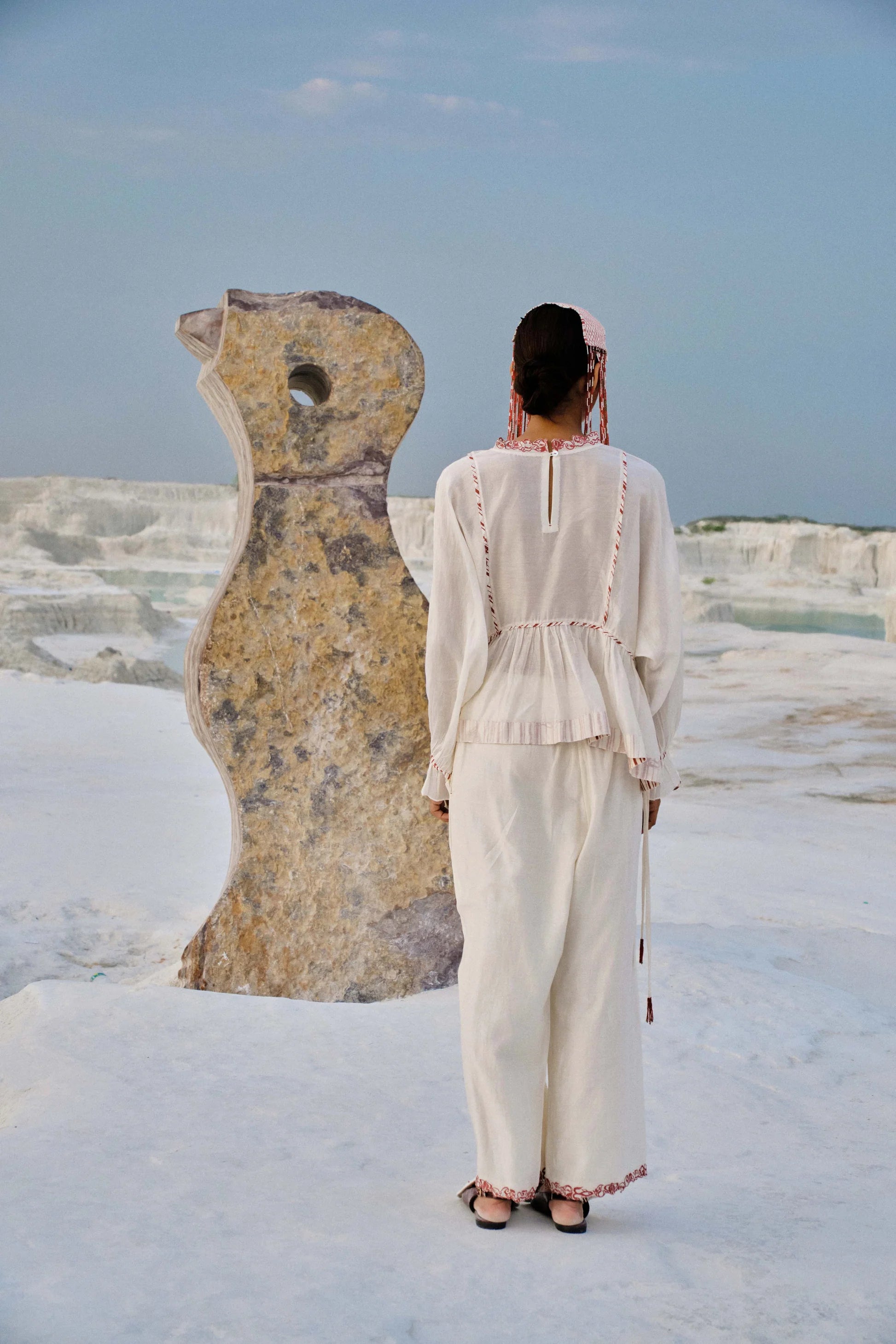 Crafted in plain cotton silk, the Thiri Embroidered Pants offer a refined foundation elevated with delicately embroidered lace along the hem. Designed for both comfort and elegance, they feature an elasticated waistband with drawstrings and functional side pockets for ease of wear. Every stitch and finishing detail reflects careful craftsmanship, creating a timeless pair that blends effortless comfort with understated artistry.