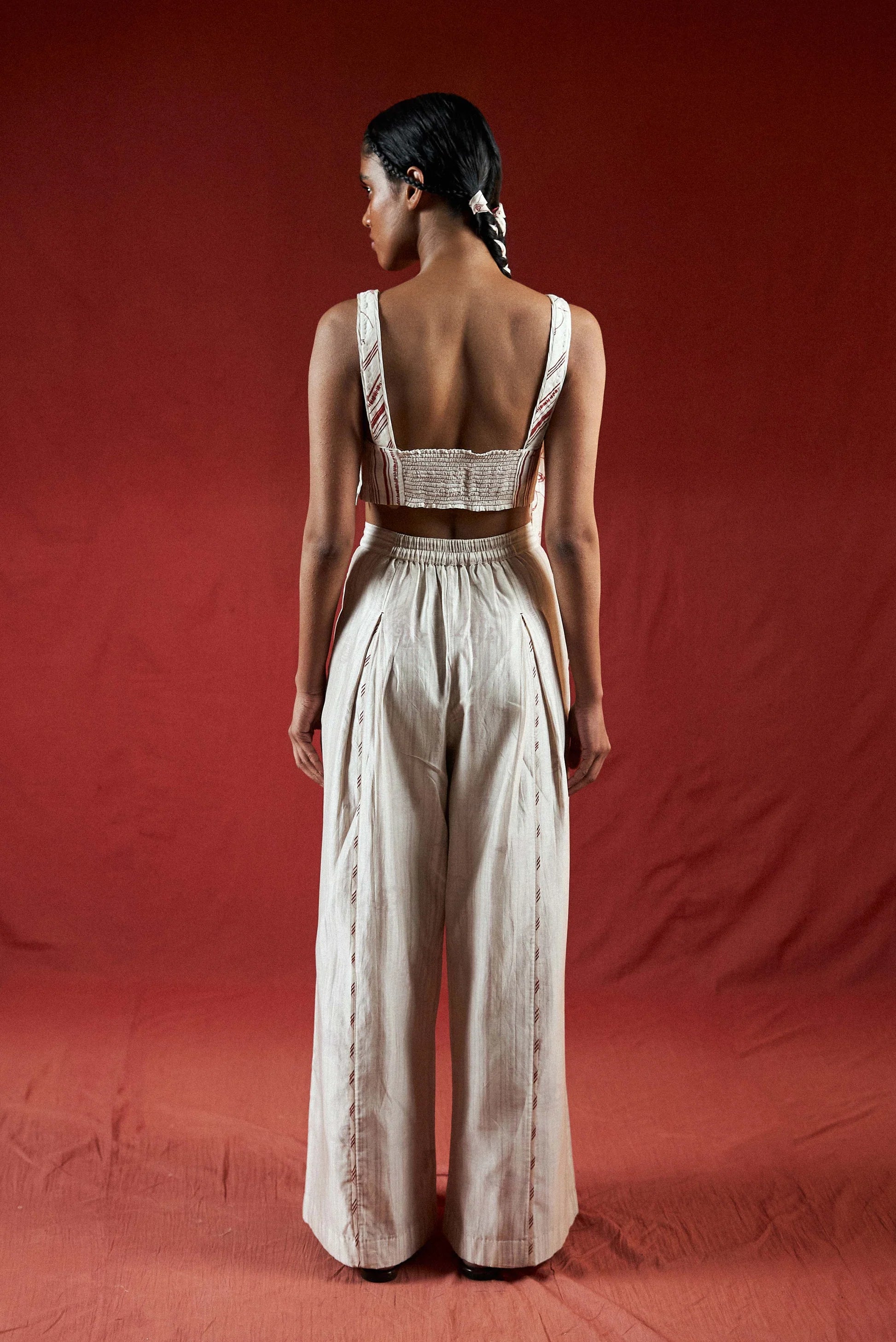Tailored in plain cotton silk with a hand-screen-printed lining, these pants balance refined structure with effortless ease. Pleated details with binding and subtle red dot accents add character, while side pockets, a front placket, and zipper closure enhance functionality. Thoughtfully designed to move seamlessly from daytime outings to evening gatherings, every element reflects careful artisanal craftsmanship.