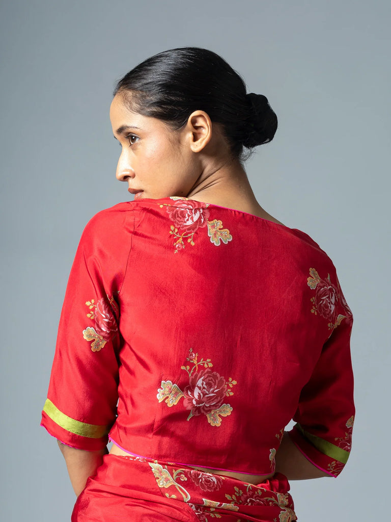 Yurma blouse in happy red is adored for its playful look, featuring a floral print, hot pink piping, and a bright green back neckline that brings it to life.